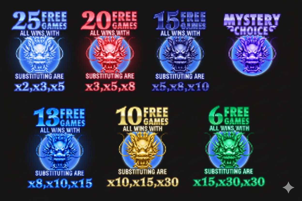 Yang menarik, ketika mode Free Spins aktif, pemain bisa memilih jenis naga yang menentukan jumlah putaran gratis dan pengali kemenangan.